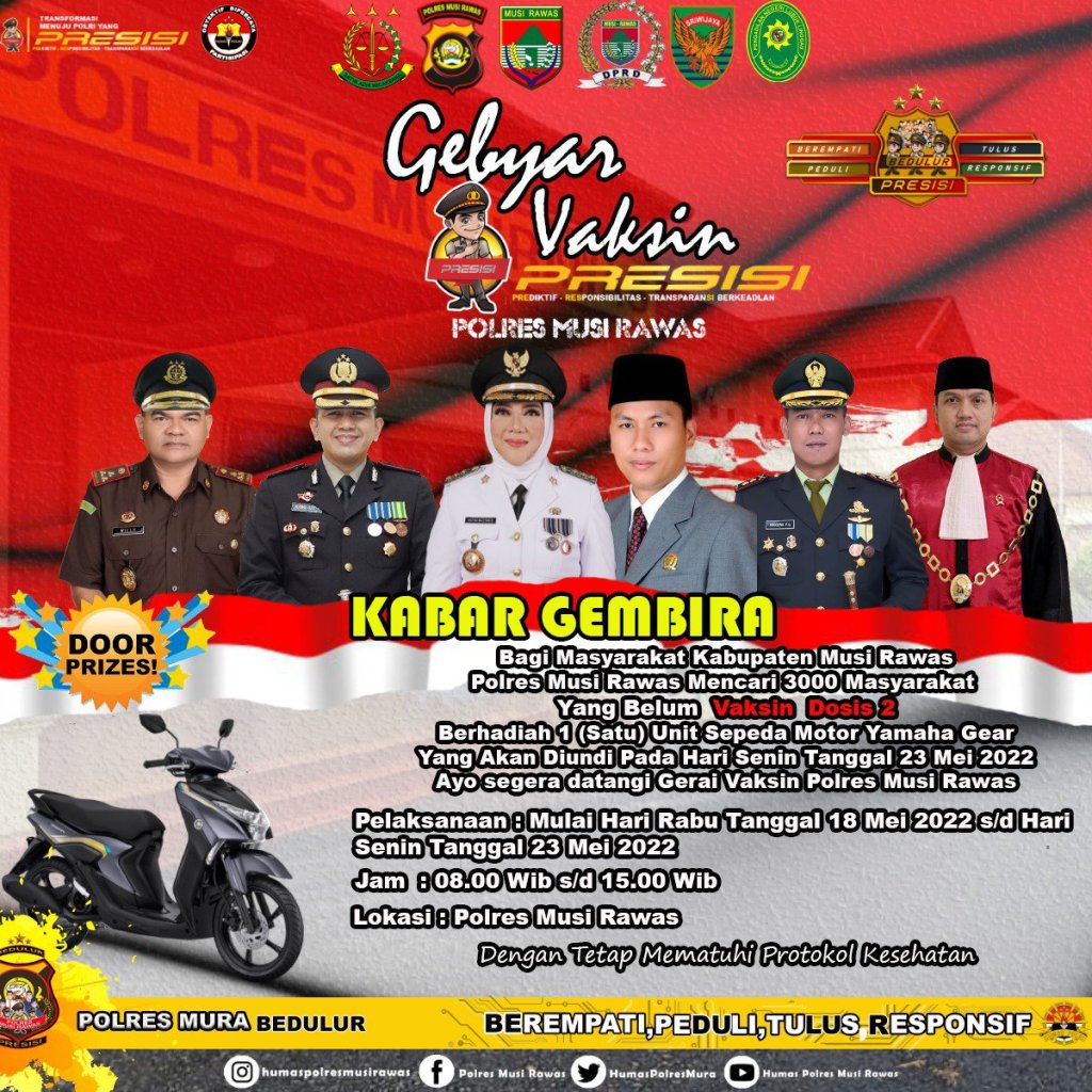 Kapolres Musi Rawas AKBP Achmad Gusti Hartono, menjelaskan bahwa Polres Musi Rawas mencari kurang lebih 3000 masyarakat yang belum vaksin dosis 2. Untuk masyarakat Kabupaten Musi Rawas yang belum vaksin dosis silakan datang ke Gerai Vaksin Polres Musi Rawas mulai dari tanggal 18 s/d 23 Mei 2022 berhadiah 1 (satu) unit sepeda motor matic Yamaha Gear yang akan diundi pada hari Senin Tanggal 23 Mei 2022.